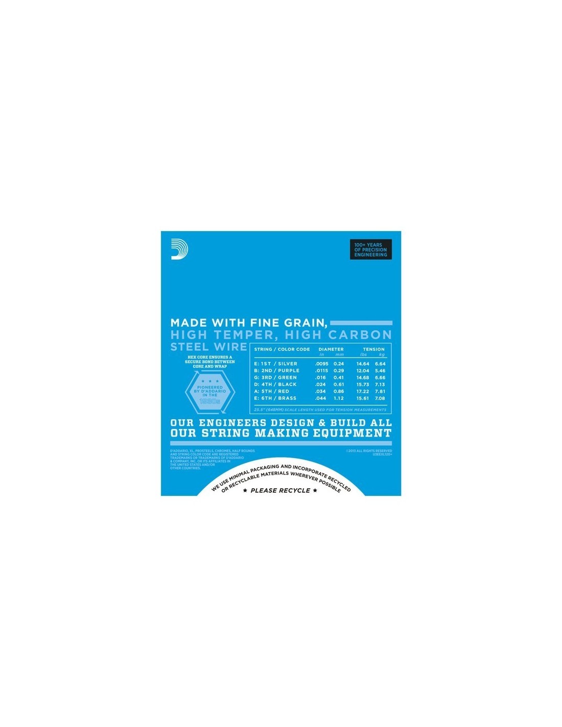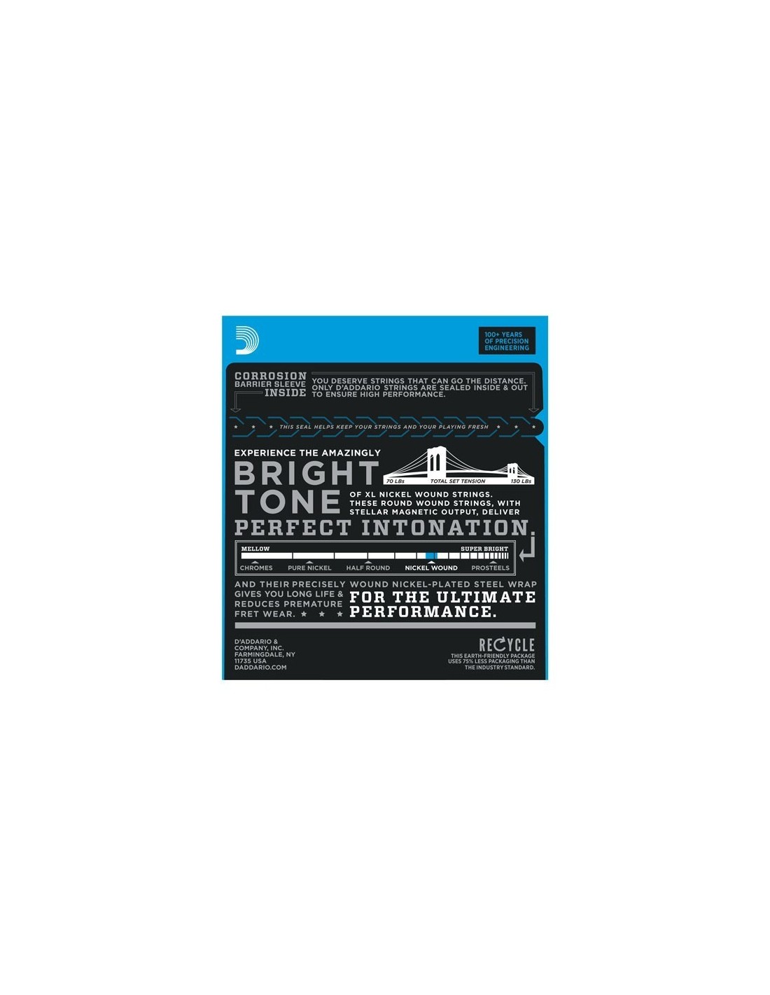 DaddarioD'Addario'nun en popüler elektro gitar telleri olan XL Nikel Kaplama, dikkatlice çekilmiş, altıgen şekilli, yüksek karbonlu çelik bir çekirdek üzerine, nikel kaplı çelikle hassas bir şekilde sarılmıştır. Sonuç, uzun ömürlü, belirgin parlak tonlu ve mükemmel tonlama özellikli teller, en geniş çeşitte gitar ve müzik stilleri için idealdir.